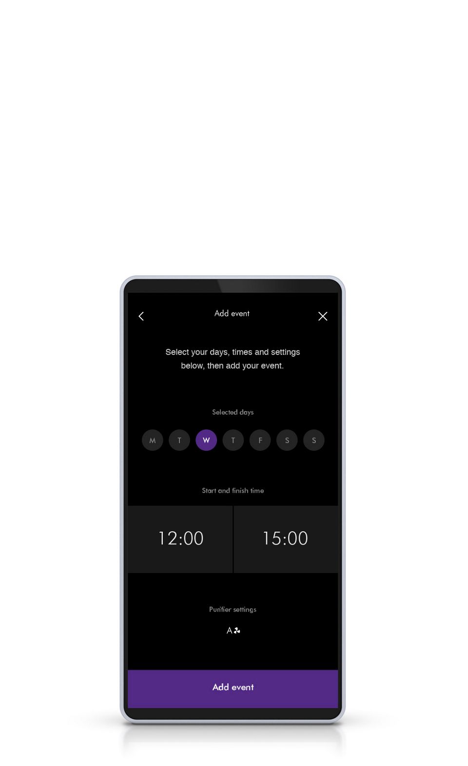 Usa la aplicación para configurar el ángulo de oscilación de tu purificador, desde flujo de aire dirigido, hasta distribución amplia y homogénea por toda la habitación.